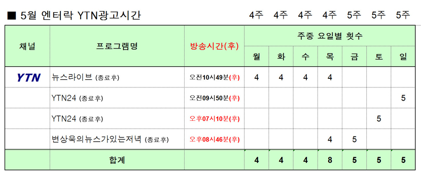 Á¦¸ñ YTN 5¿ù ±¤°í ½Ã°£Ç¥